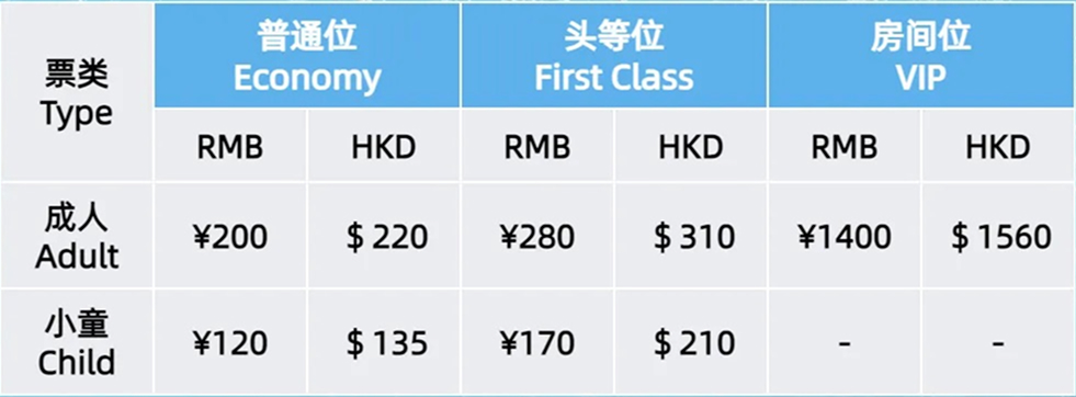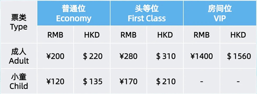 优惠套票:普通位来回套票人民币¥320元/套;港币$370元/套。