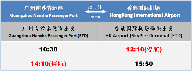 因船舶调度影响,2025年4月15日南沙客运港往返香港国际机场线部分航班暂停营运,具体航班时间如下: