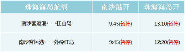 接船务公司通知,1月14日南沙客运港往返珠海海岛航线暂停服务,具体航班时间如下: