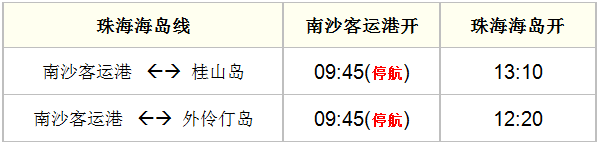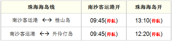 接船务公司通知,12月5日至19日期间逢周五、六、日南沙客运港往返珠海海岛航线暂停服务,具体航班时间如下: