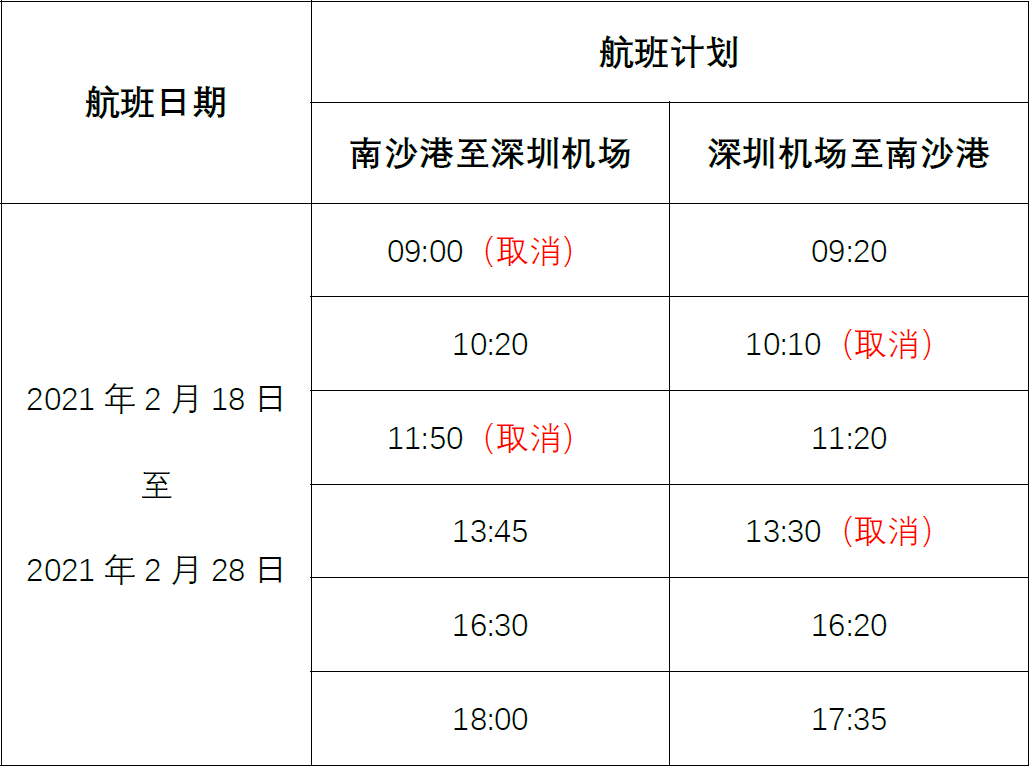 因船舶维修和调度原因,2月18日至28日深圳机场航线航班服务时间临时调整,具体航班时间如下: