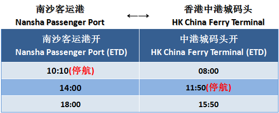 海面大雾影响船舶航行安全,2024年3月18日南沙客运港往返香港中港城航班部分暂停营运,具体航班时间如下: