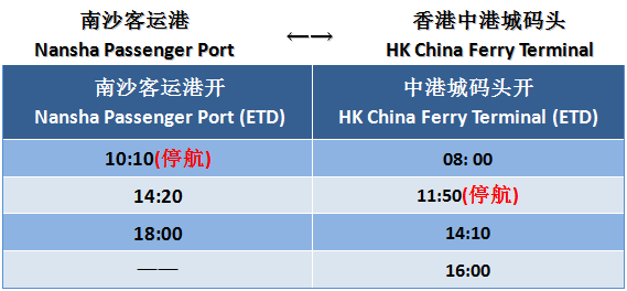 受突发天气影响,2024年4月21日南沙客运港往返香港中港城、珠海海岛部分航班暂停营运,具体航班时间如下: