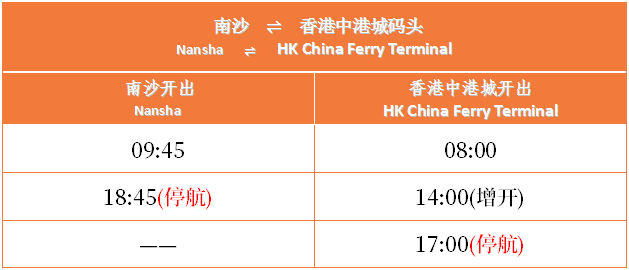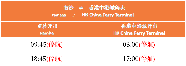 受台风“桦加沙”影响,2025年9月22日至25日南沙客运港往返香港中港城、香港国际机场部分航班暂停营运,具体航班时间如下: